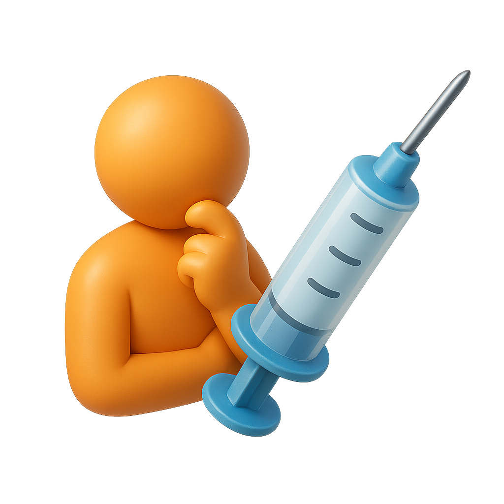 A 3D icon depicting a stylized figure in a thoughtful pose next to a syringe. The figure is orange and the syringe is blue, set against a gradient background.