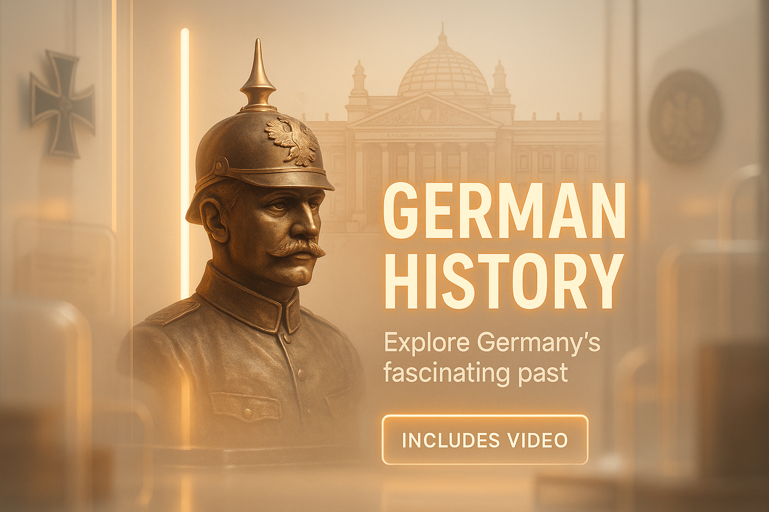 /Collection: /by davooda/Type: PNG/Engaging promotional image highlighting German history with a focus on a historical figure, featuring a warm color palette and elegant design, ideal for educational content and video presentations.