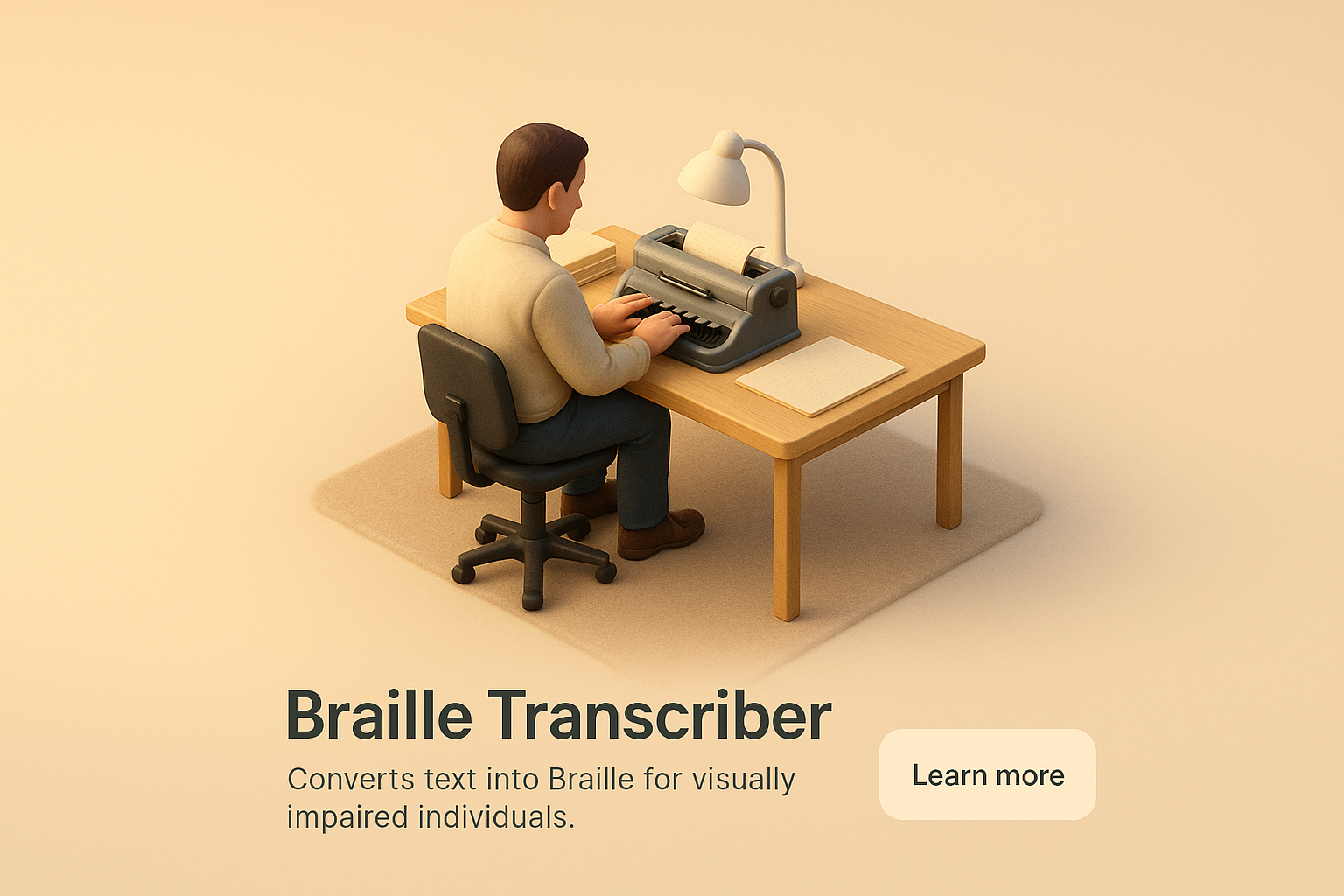 /Collection: /by davooda/Type: PNG/A detailed 3D illustration showing a Braille transcriber at a desk, converting text for visually impaired users. The scene is designed with a smooth gradient background and minimal elements.