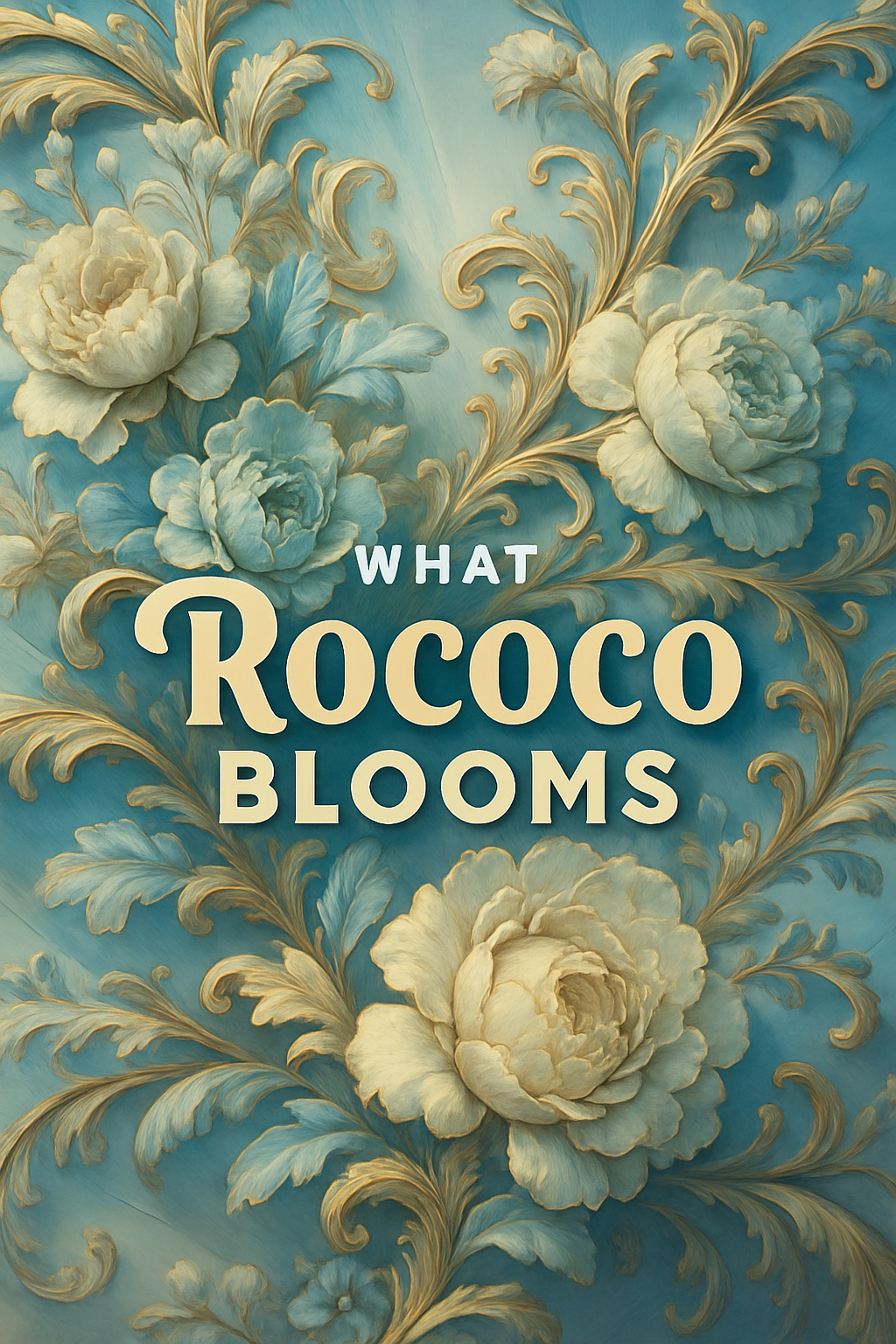 An intricate rococo wallpaper design featuring blooming flowers in soft pastel blues and golds, blending fantasy aesthetics with luxurious details.