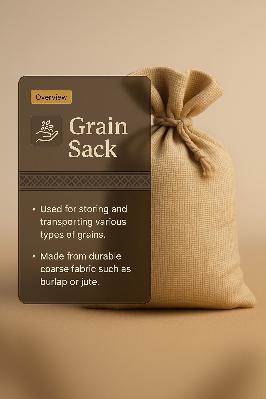 A 3D illustration of a grain sack crafted from durable fabric, featuring an informative overlay. The design includes a subtle gradient background, enhancing the visual appeal.