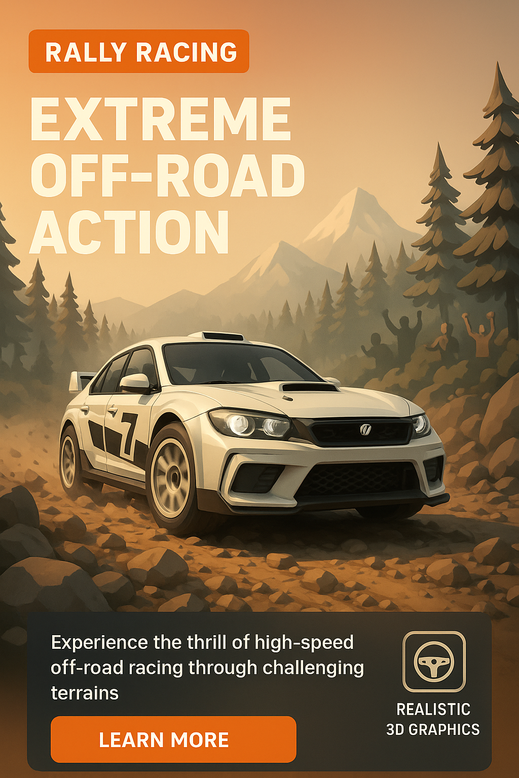 A promotional banner showcasing a rally racing scene. It features a stylized car in a rugged terrain, designed to attract adventure enthusiasts.