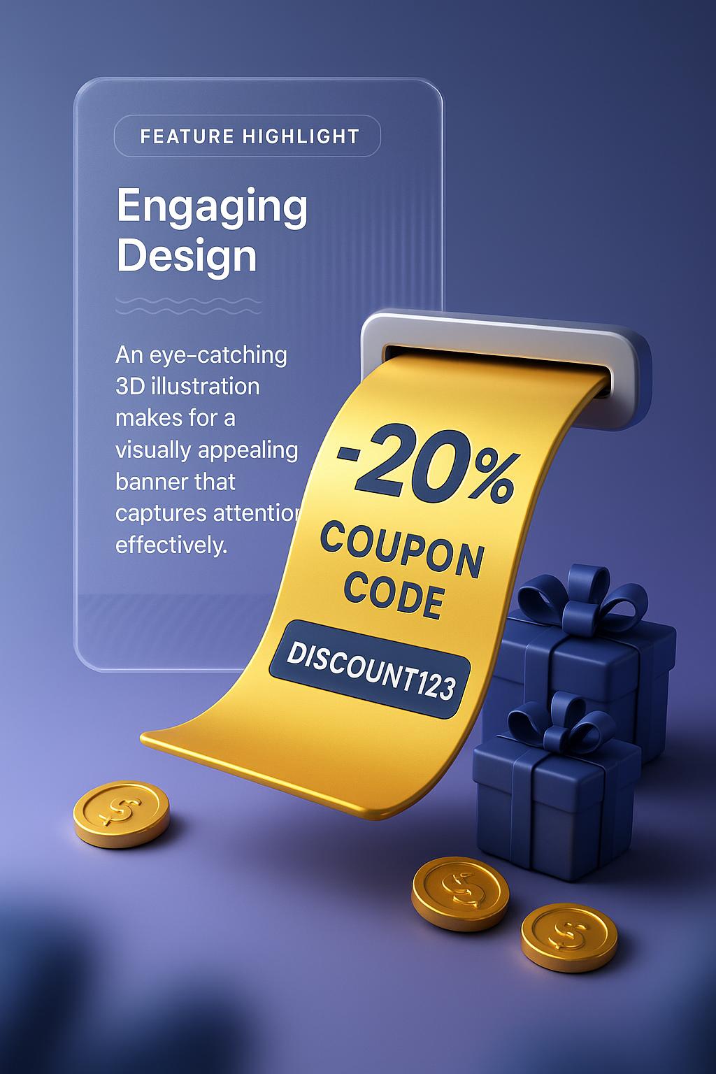 /Collection: /by davooda/Type: PNG/A dynamic 3D illustration of a golden coupon being printed, showcasing a discount percentage and coupon code, accompanied by gift boxes and coins on a smooth gradient background.