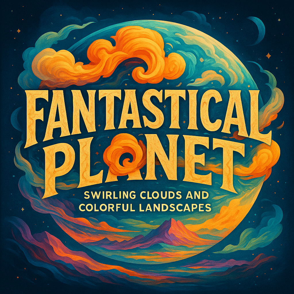 Vibrant digital artwork depicting a fantastical planet with swirling clouds and colorful landscapes, ideal for fantasy-themed projects or creative marketing.