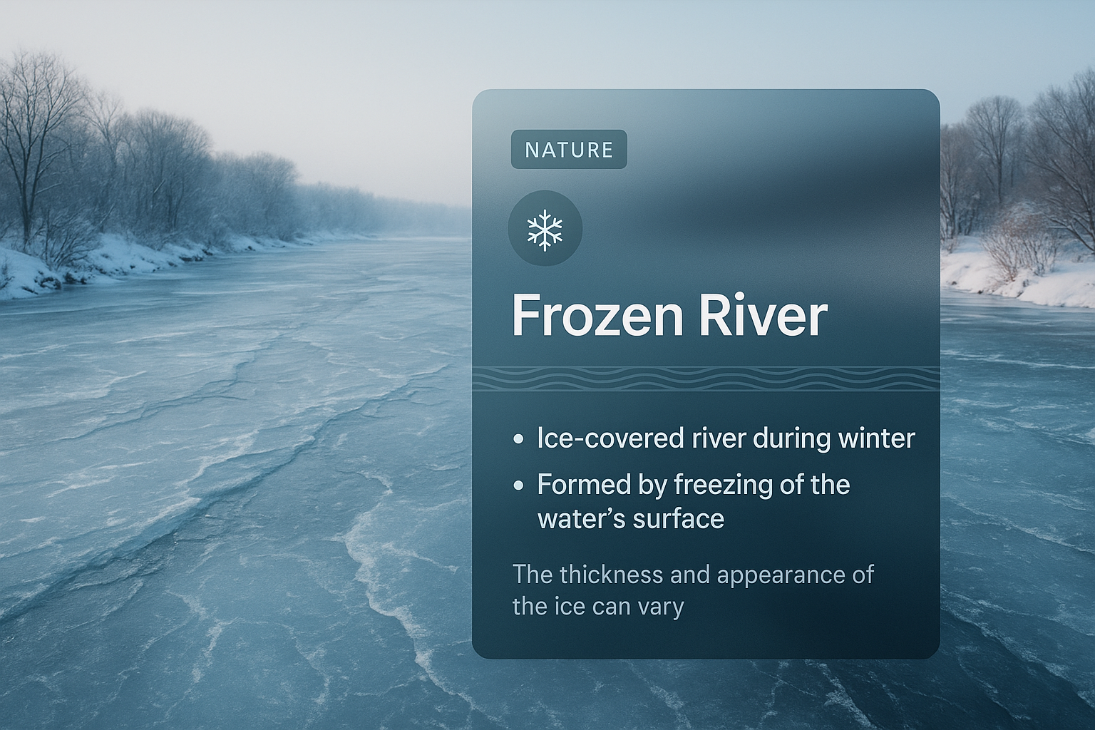 /Collection: /by davooda/Type: PNG/A tranquil image of a frozen river surrounded by trees, featuring an overlay with information on the river's characteristics. The scene captures the essence of winter's beauty.