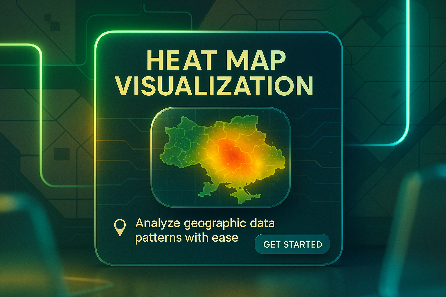 Modern graphic showcasing a heat map visualization interface, designed for analyzing geographic data patterns. Ideal for data analytics platforms.