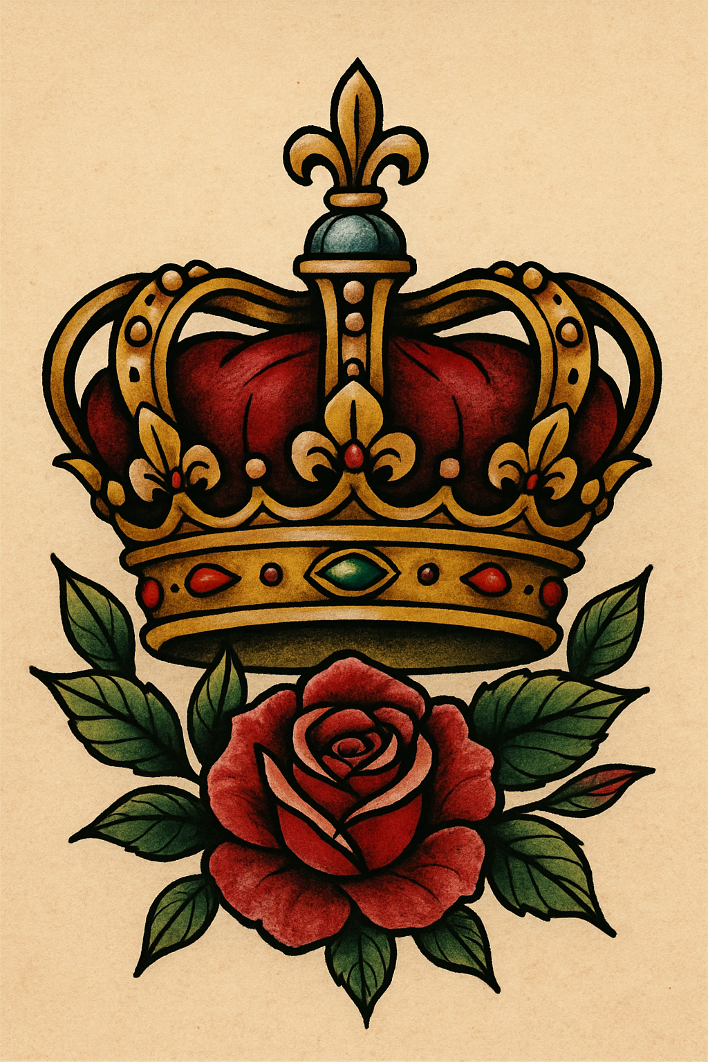A detailed illustration featuring a royal crown atop a blooming rose, styled in a vintage tattoo art aesthetic. Ideal for tattoo design inspiration or art print.