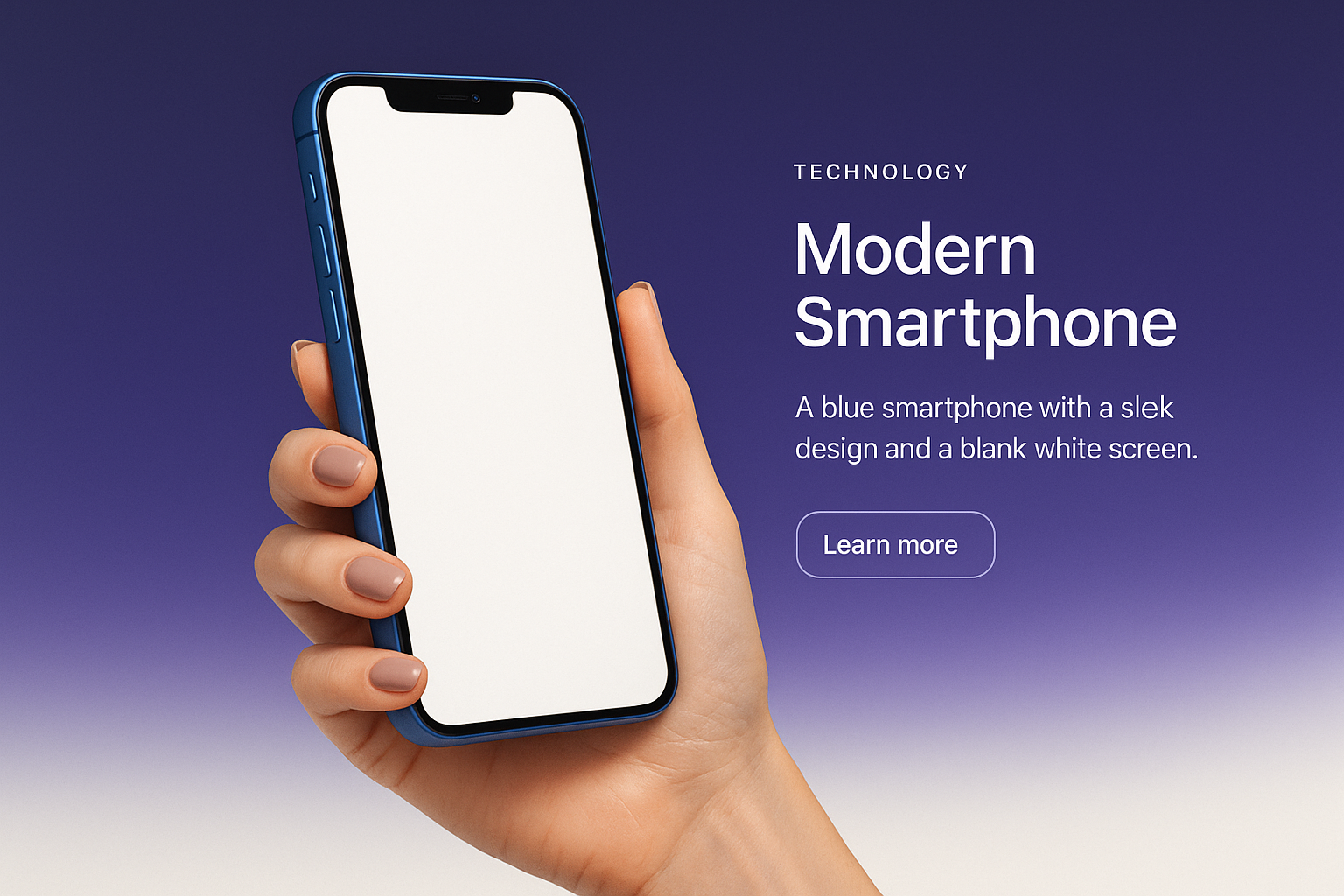 A stylish blue smartphone held in a manicured hand, showcasing a blank white screen against a gradient background. Perfect for modern technology themes.