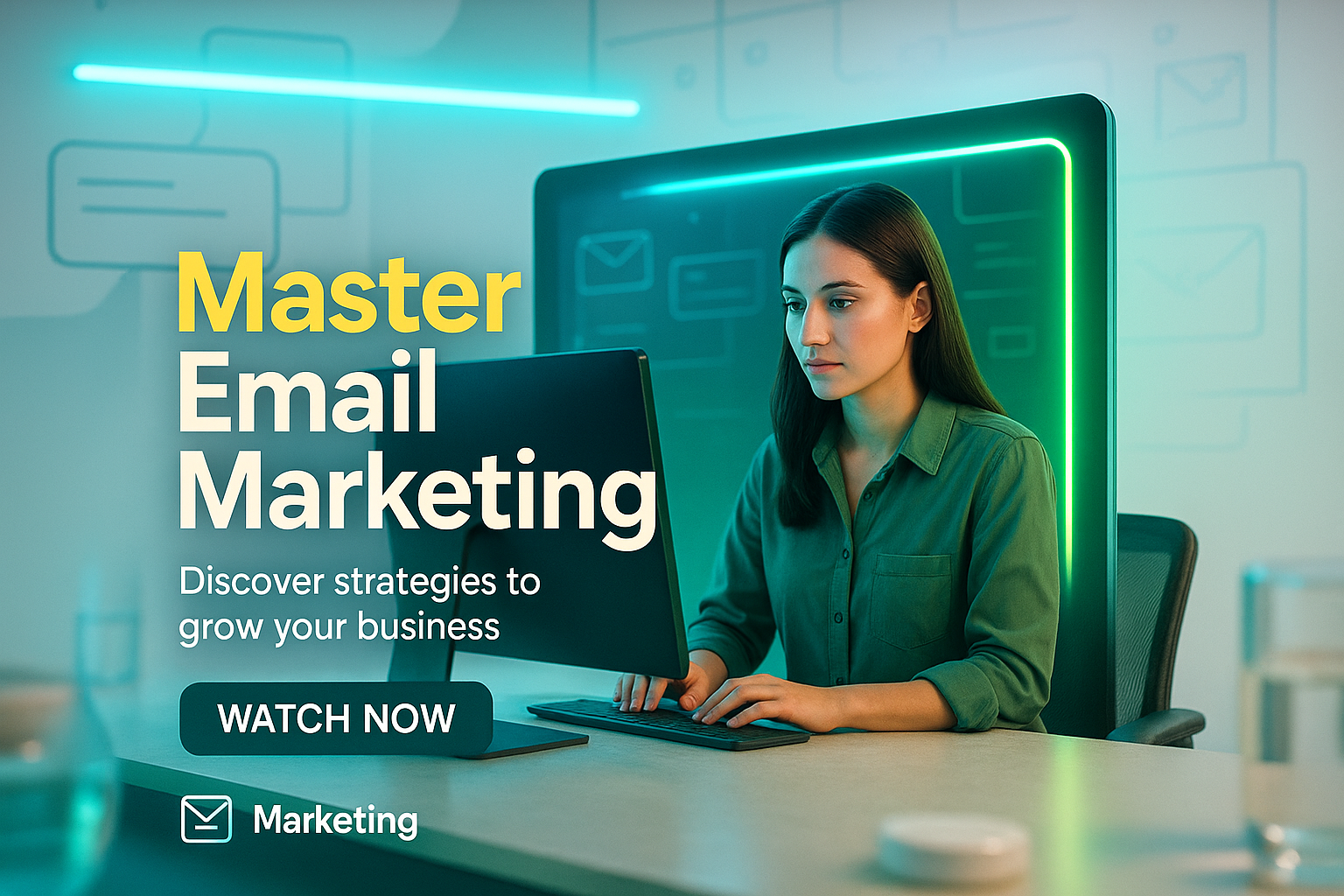 A modern promotional graphic showcasing a woman working on email marketing strategies, ideal for digital marketing campaigns and online courses.