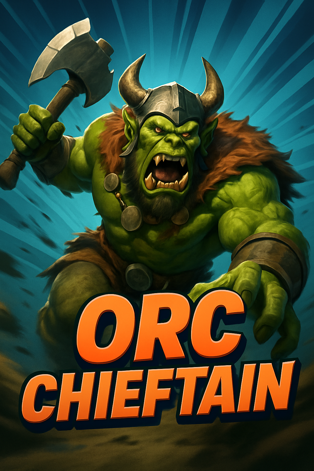 A powerful orc chieftain is depicted mid-action, wielding an axe with fierce expression. The background features dynamic rays emanating from the center, enhancing the sense of movement.
