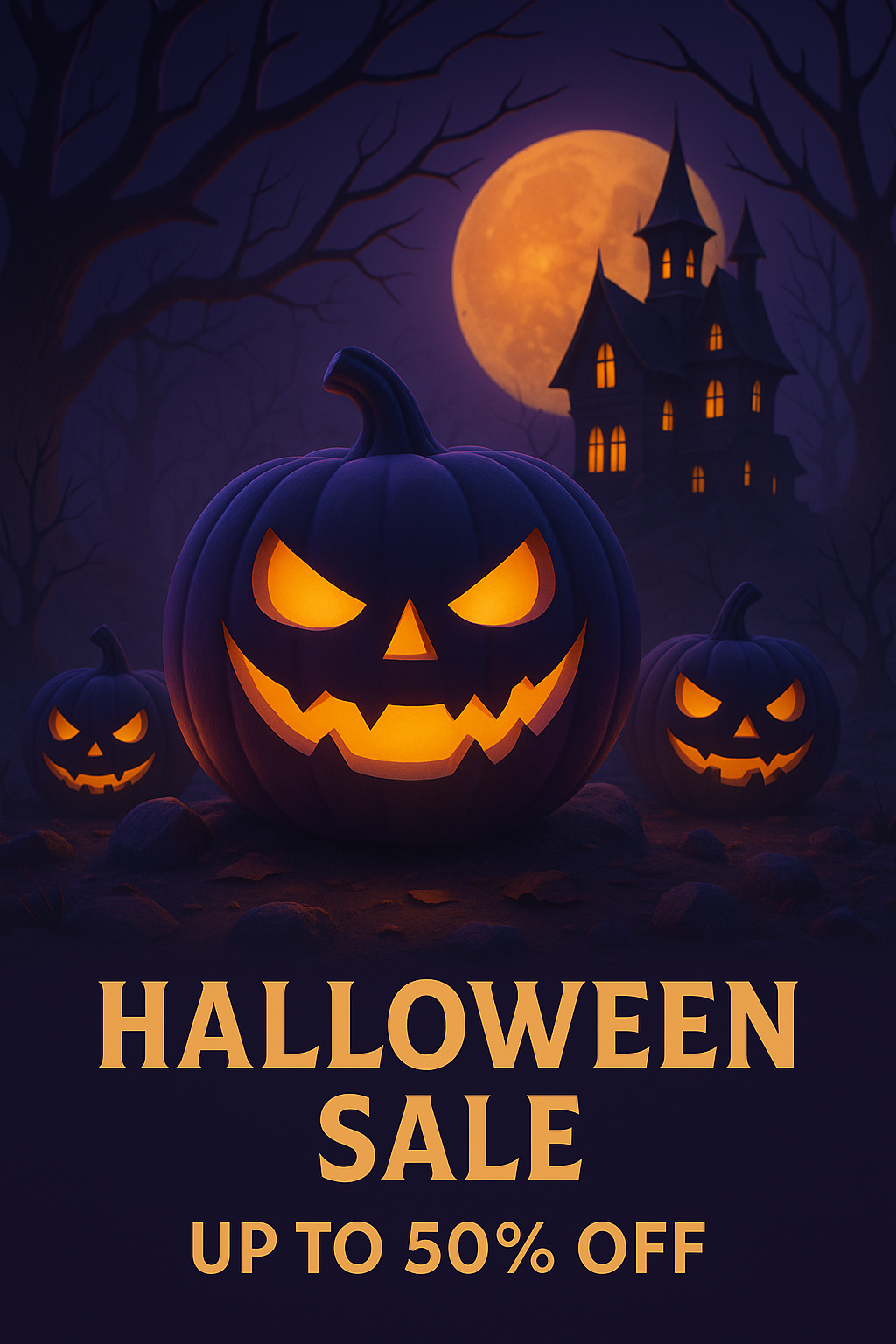 Vibrant Halloween sale banner showcasing carved pumpkins and a haunted house under a full moon, designed to attract seasonal shoppers with a spooky theme.