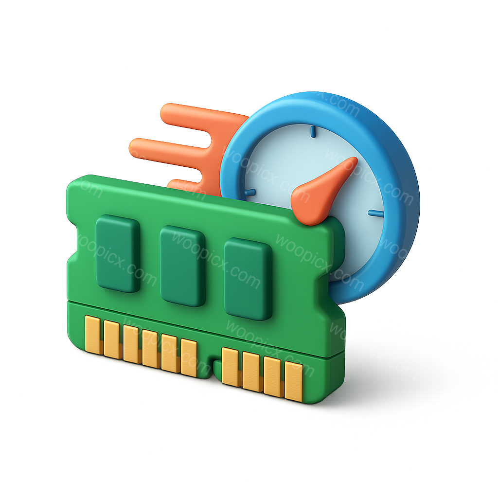 /Premium/Collection: /by davooda/Type: PNG/A vibrant 3D icon representing RAM, featuring a green module with a clock and dynamic elements. The design has an isometric view and a transparent background, emphasizing depth and volume.