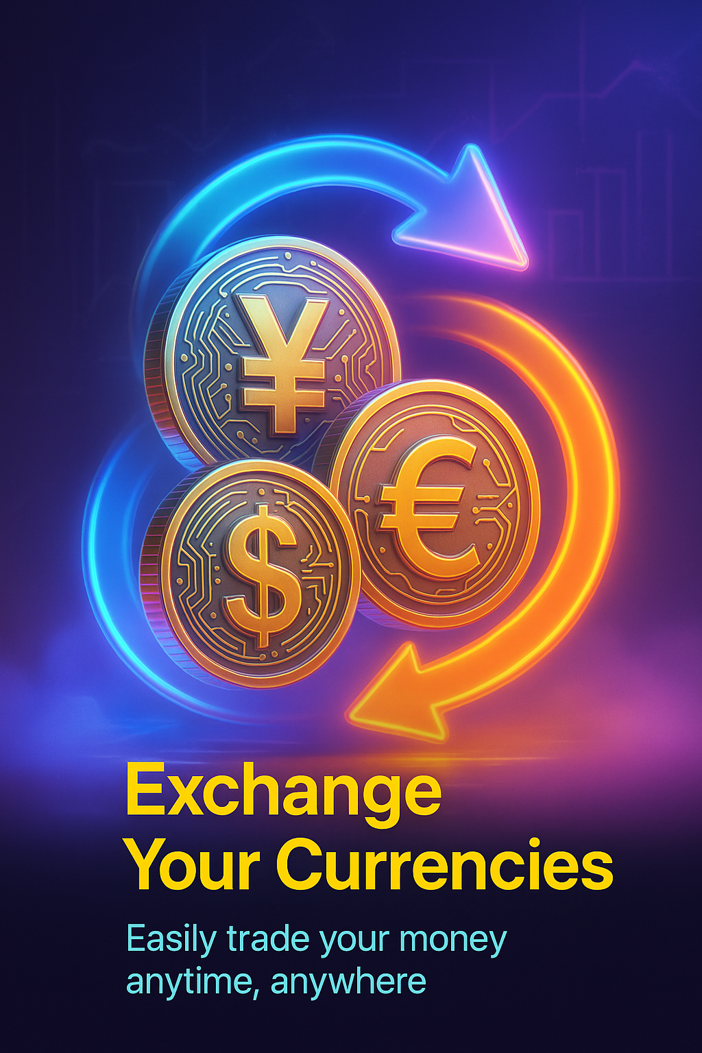 Vibrant promotional graphic showcasing currency exchange, featuring stylized coins and dynamic arrows, ideal for financial services marketing.