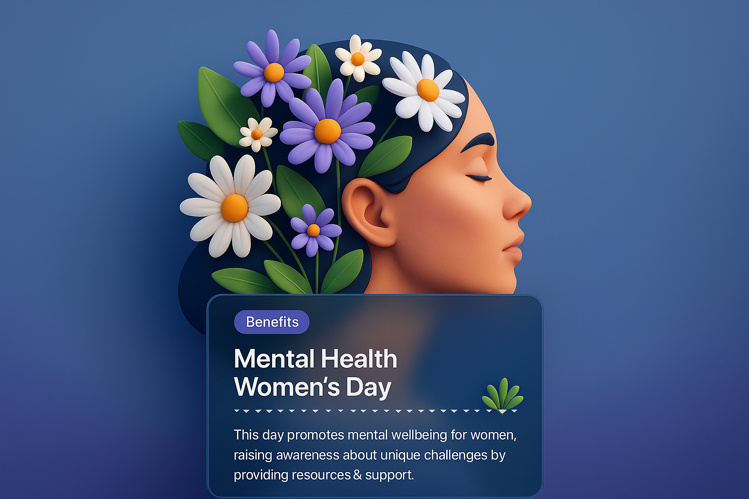 /Collection: /by davooda/Type: PNG/A striking double exposure illustration featuring a woman's profile intertwined with vibrant flowers, symbolizing mental health awareness for Women's Day.