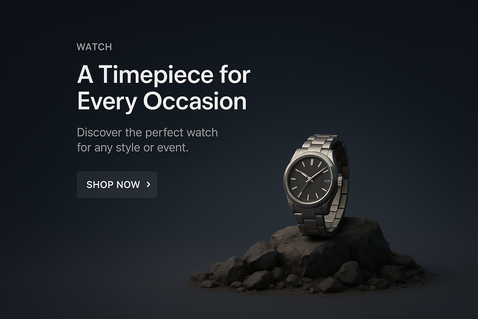 A modern watch is prominently featured on a rocky base against a dark gradient background. The scene conveys elegance with a clear call to action for shoppers.