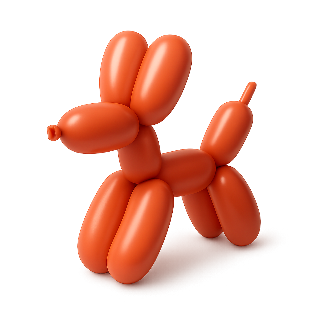 This image features a vibrant 3D balloon unicorn in an isometric view, showcasing its playful design with a glossy finish against a warm gradient background.