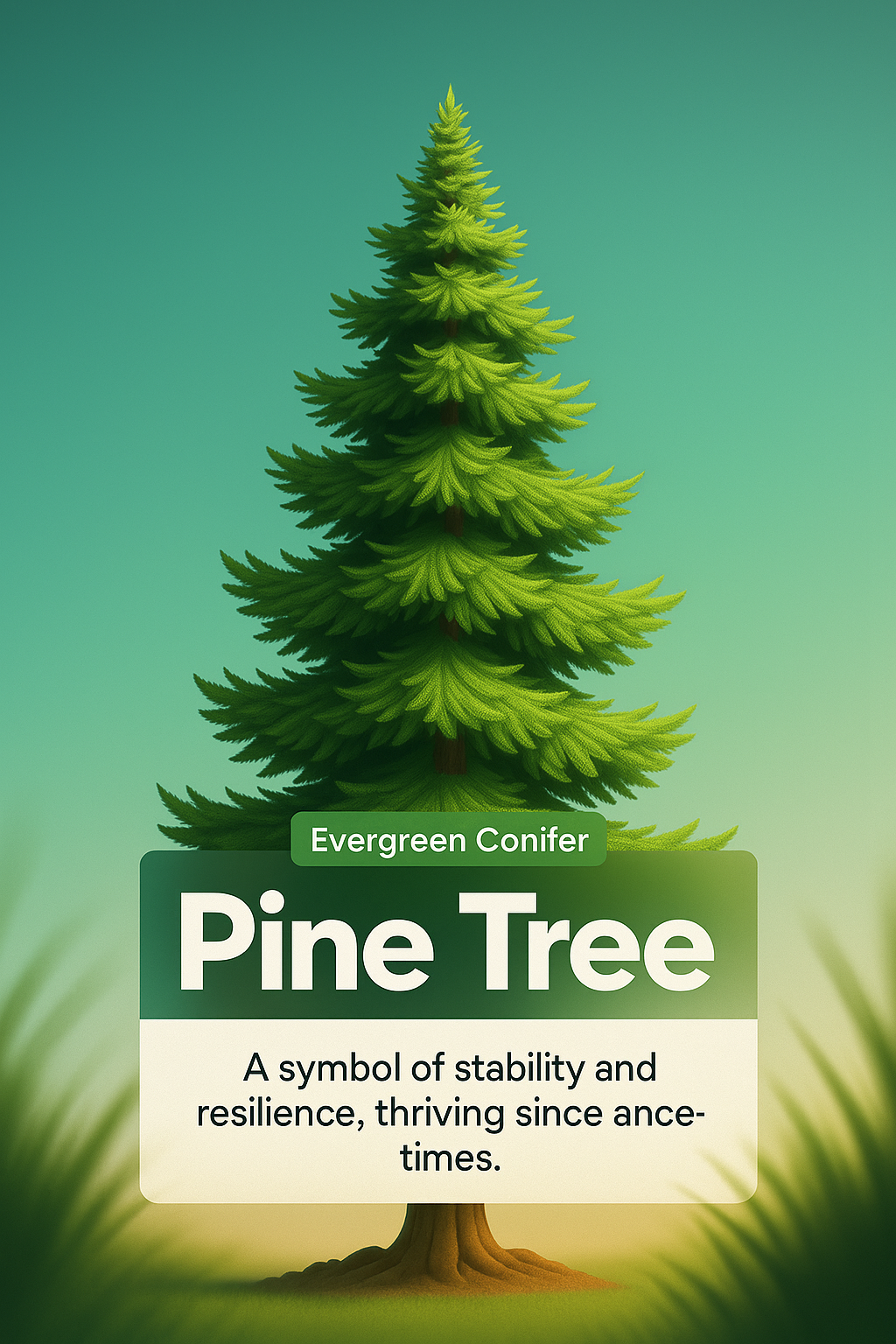 /Collection: /by davooda/Type: PNG/A vibrant 3D illustration of a pine tree, set against a smooth gradient background. The design features clear, readable text highlighting the tree's symbolism of stability.