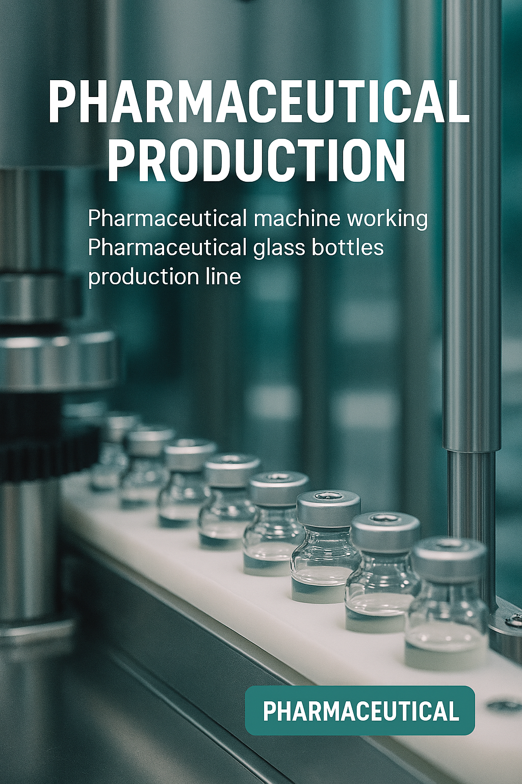 Focused image showcasing a pharmaceutical production line featuring glass bottles and machinery, ideal for industry-related content and marketing.