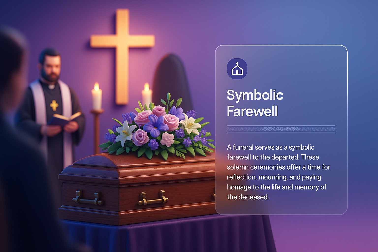 /Collection: /by davooda/Type: PNG/A serene funeral scene featuring a beautifully decorated coffin with flowers. A solemn figure conducts the service, creating a reflective and reverent atmosphere.