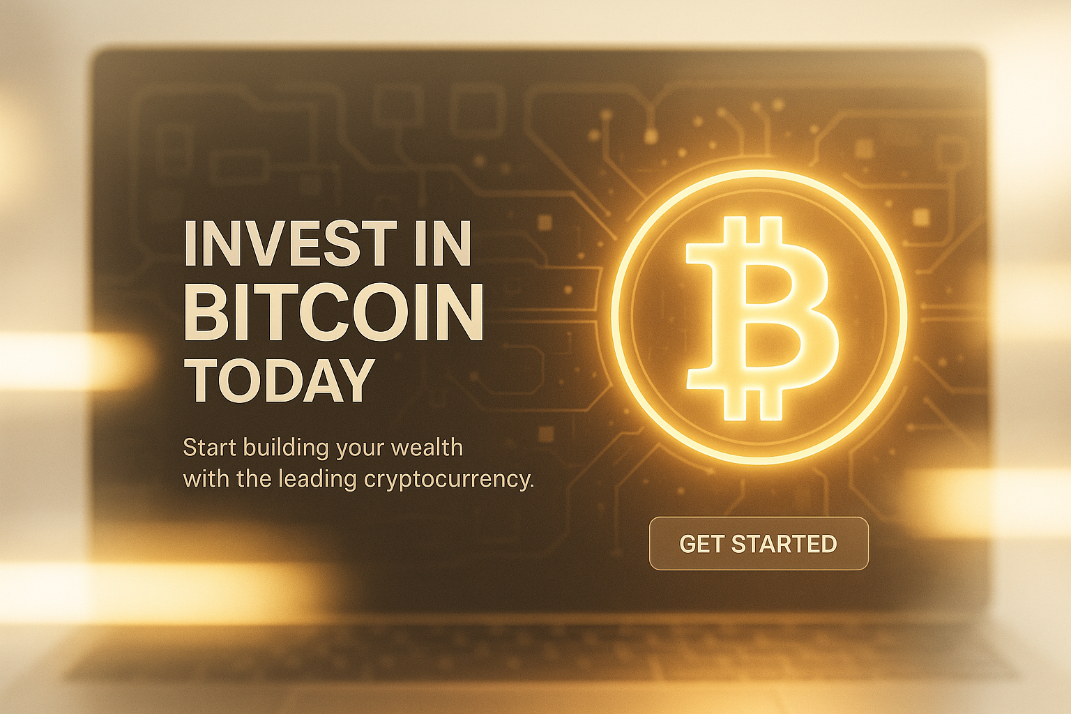 /Collection: /by davooda/Type: PNG/Engaging promotional image featuring a glowing Bitcoin symbol and call-to-action for investing. Ideal for cryptocurrency marketing and finance-related campaigns.