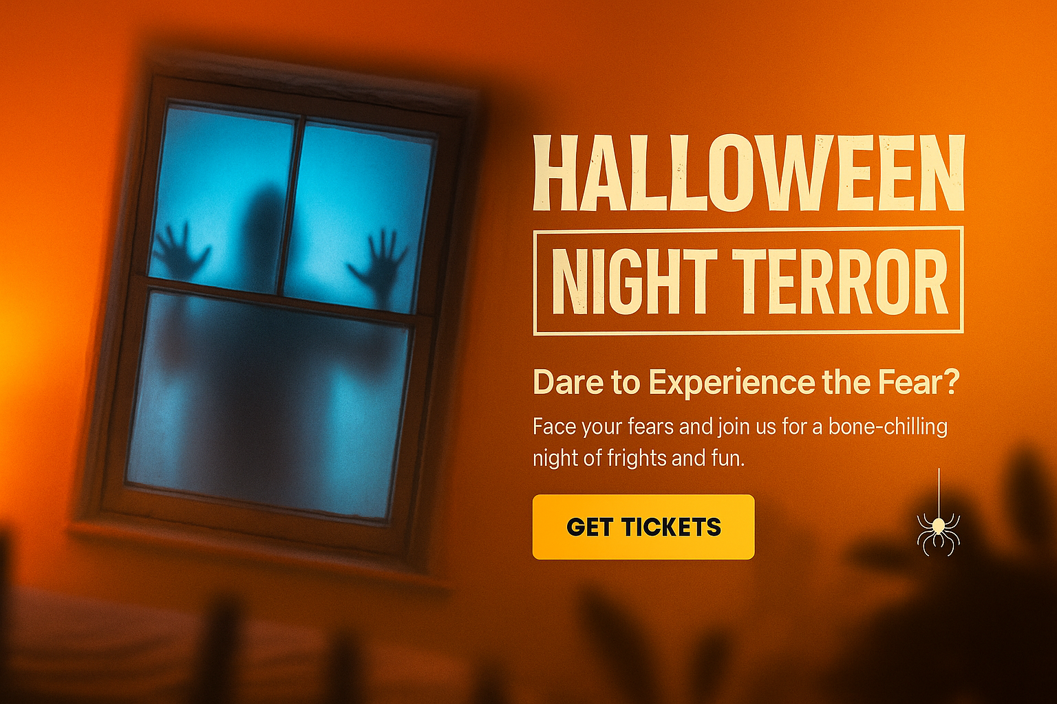 /Collection: /by davooda/Type: PNG/A haunting silhouette of a ghostly figure appears in a bedroom window, illuminated against a vibrant, solid color backdrop. The scene evokes a spine-tingling Halloween atmosphere.