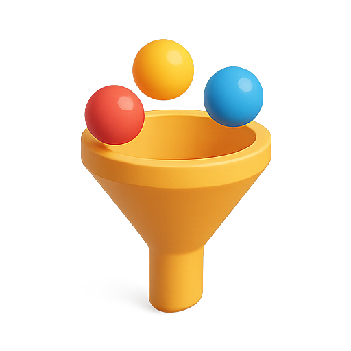/Collection: /by davooda/Type: PNG/A vibrant 3D illustration featuring a yellow funnel with colorful balls entering it, symbolizing the concept of sorting or filtering. Ideal for educational or marketing materials related to data analysis or process optimization.