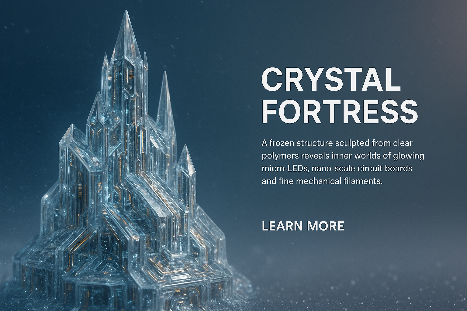/Collection: /by davooda/Type: PNG/A hyperrealistic close-up of a frozen crystal fortress, showcasing intricate details of glowing micro-LEDs, nano-scale circuit boards, and polished metallic components, all under soft cinematic lighting.