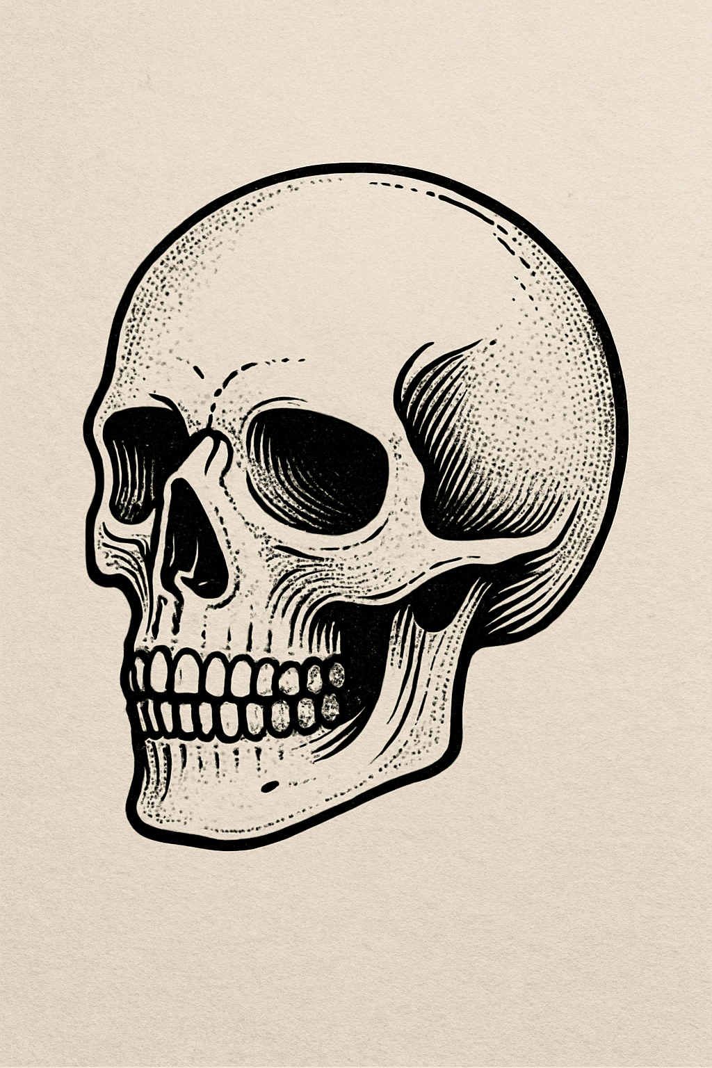 A detailed illustration of a skull, showcasing a vintage aesthetic. This graphic can be used for art prints, tattoos, or educational materials.