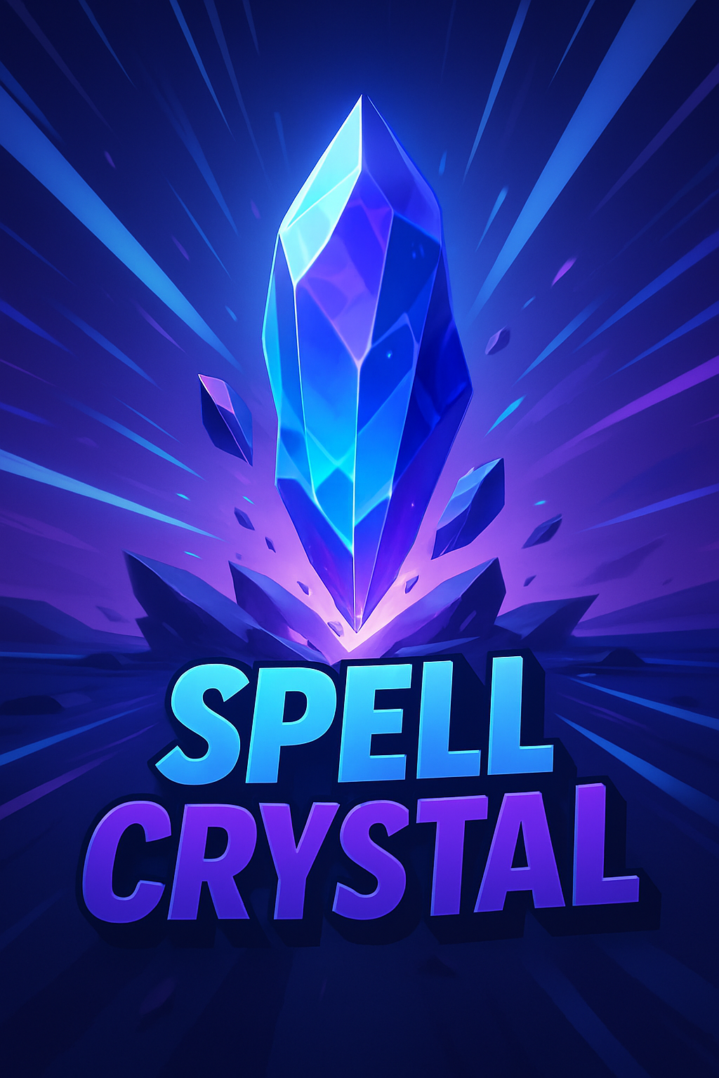 A striking 3D illustration of a spell crystal emitting dynamic energy rays, set against a smooth gradient background. The title 'SPELL CRYSTAL' is prominently displayed, enhancing the visual impact.