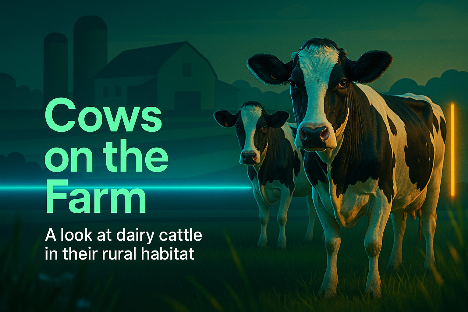 A visually appealing graphic featuring dairy cattle in a farm setting, highlighting their rural habitat. The design combines vibrant colors and modern typography, suitable for agricultural or educational content.