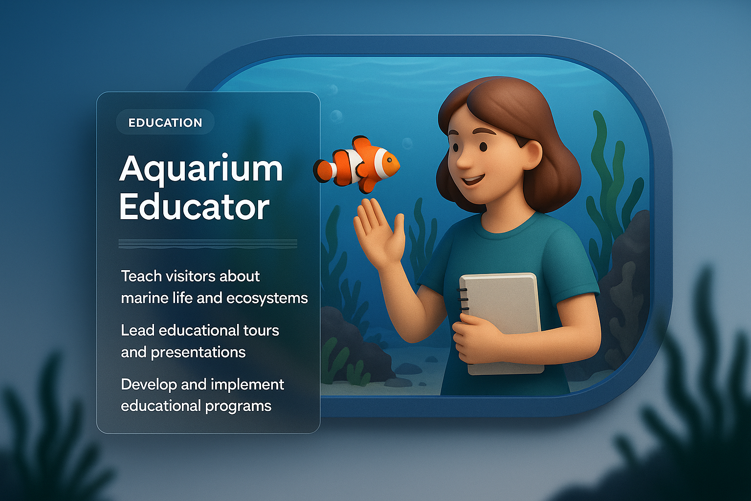 /Collection: /by davooda/Type: PNG/A vibrant 3D illustration of an aquarium educator interacting with a clownfish, designed with a gradient background and integrated text blocks for educational content.