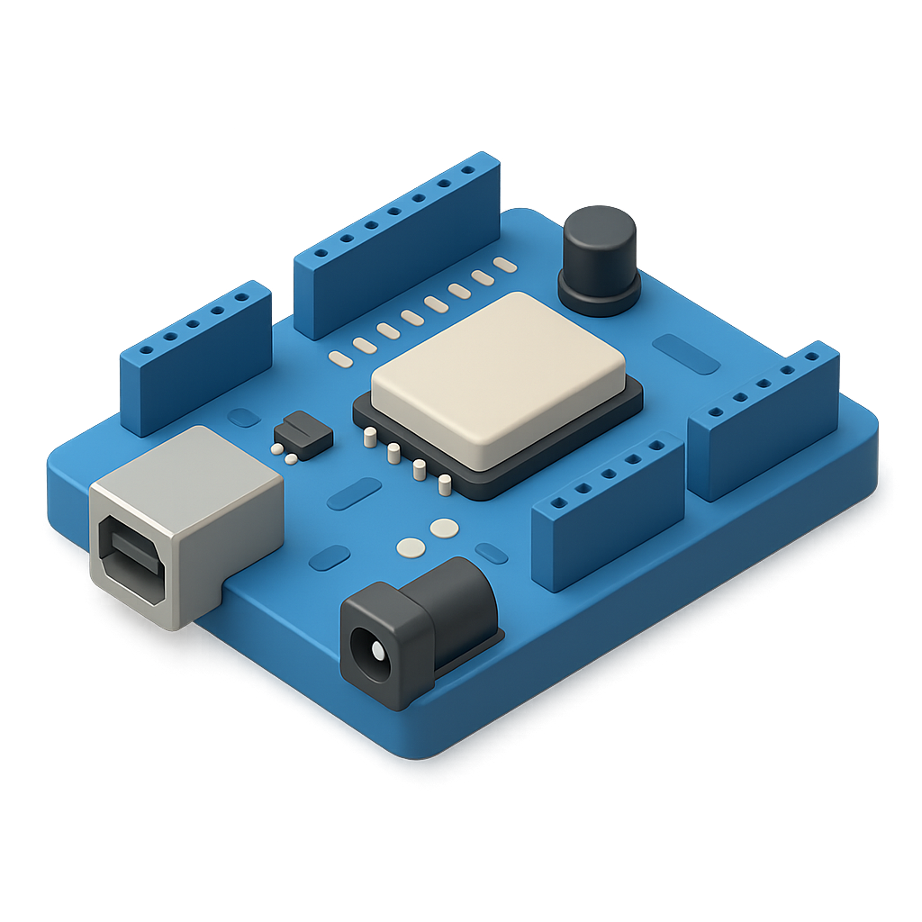 /Collection: /by davooda/Type: PNG/A detailed 3D representation of an Arduino board, showcasing its components in a three-quarter view. The icon features a transparent background and a modern, volumetric design.