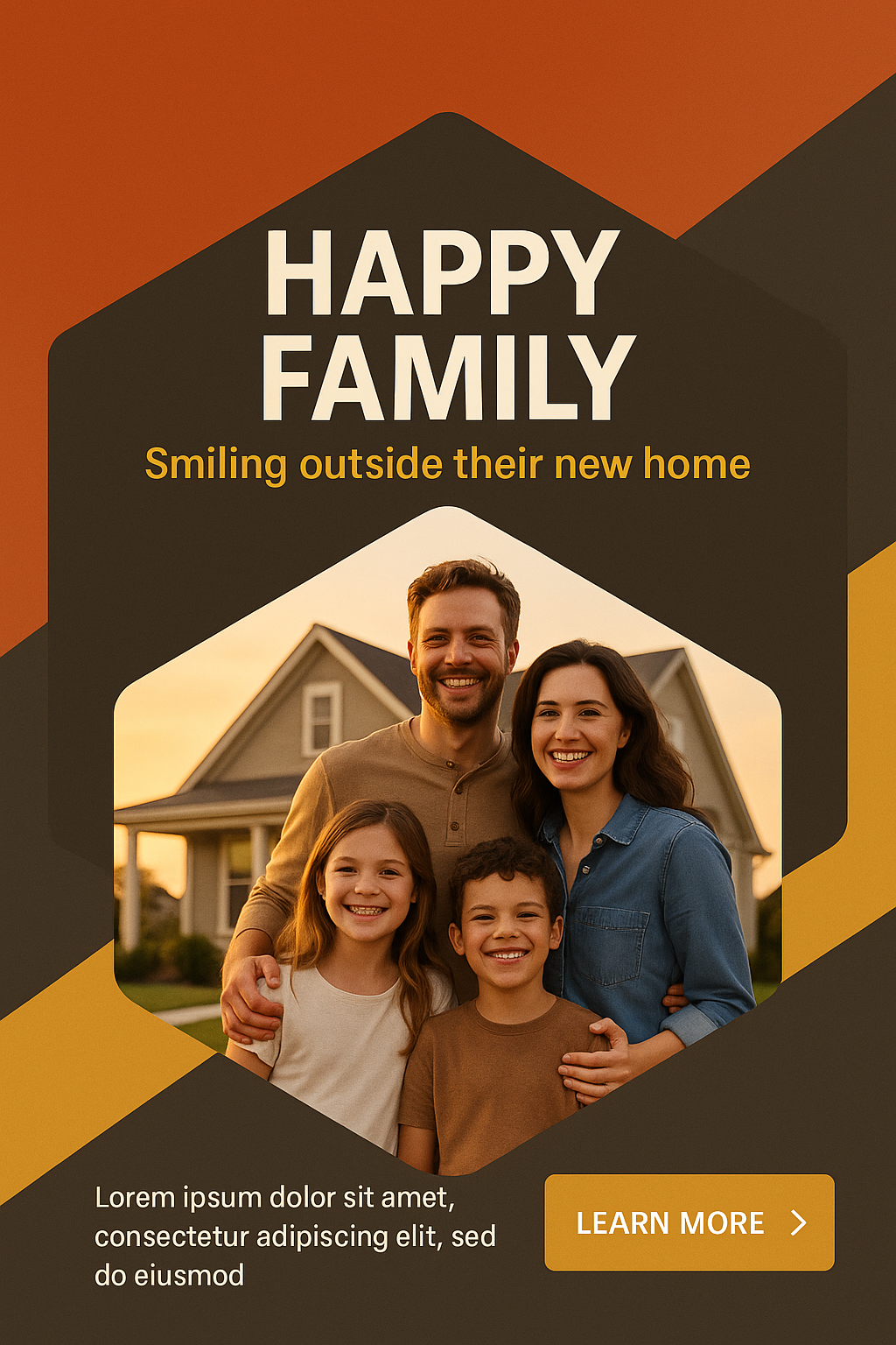 /Collection: /by davooda/Type: PNG/A joyful family stands outside their new home during a beautiful sunset. The composition features layered geometric shapes and a warm color palette, creating a welcoming atmosphere.