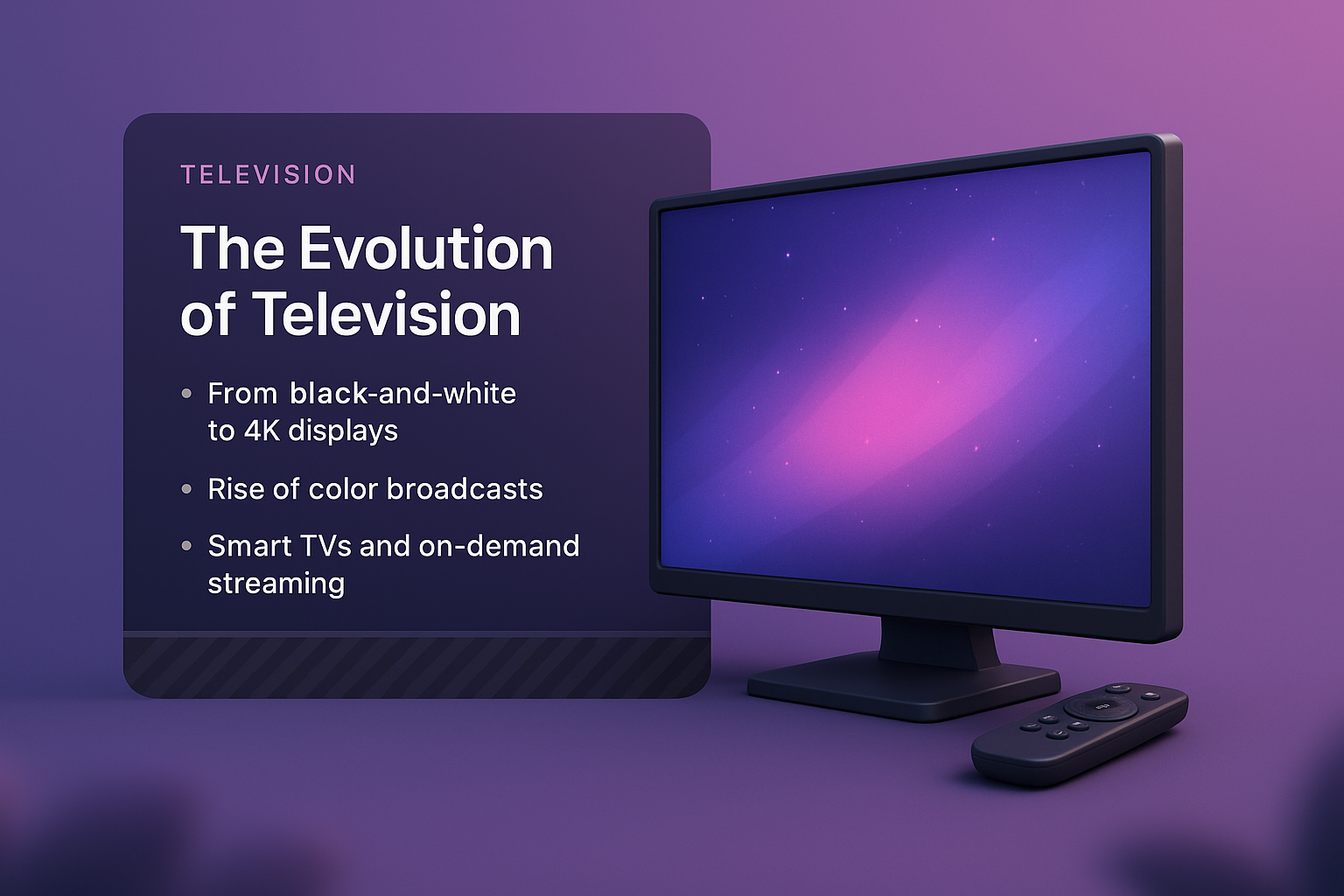 A modern 3D illustration showcasing the evolution of television with a sleek monitor displaying a gradient screen. Accompanied by a dark panel featuring key points about TV advancements.