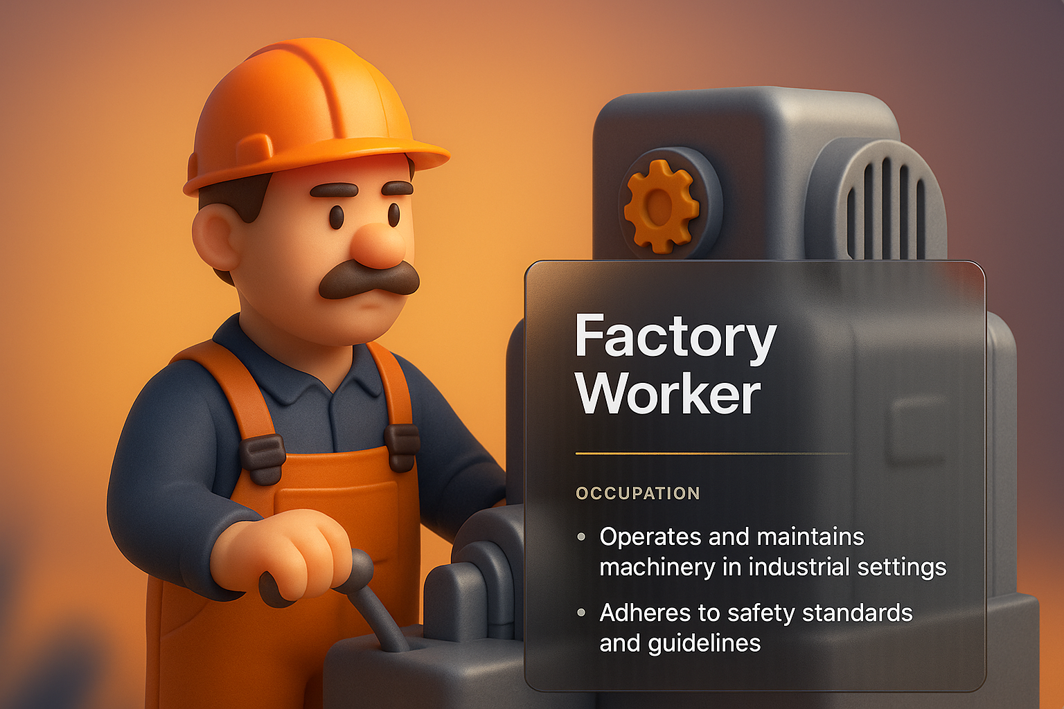 /Collection: /by davooda/Type: PNG/A detailed 3D illustration of a factory worker operating machinery, set against a smooth gradient background. The image features a transparent overlay with text highlighting the worker's occupation and responsibilities.