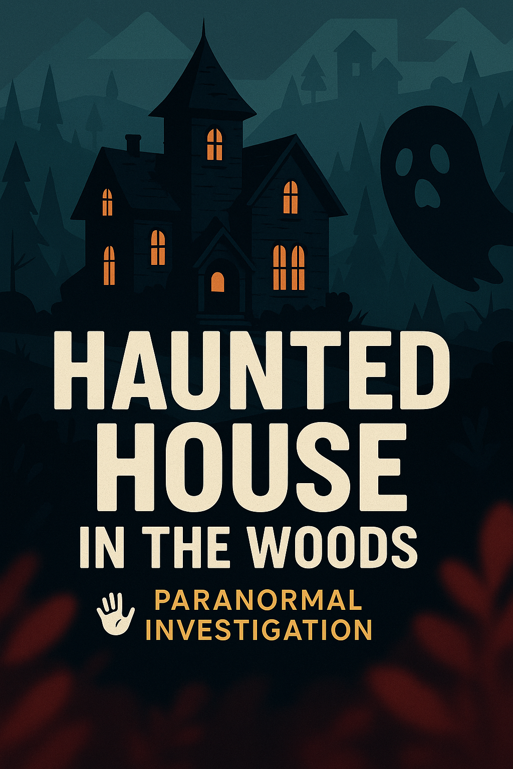 /Collection: /by davooda/Type: PNG/A captivating digital illustration depicting a haunted house in a dark forest, designed for paranormal investigation themes. The eerie color palette and ghostly figure enhance its spooky appeal.