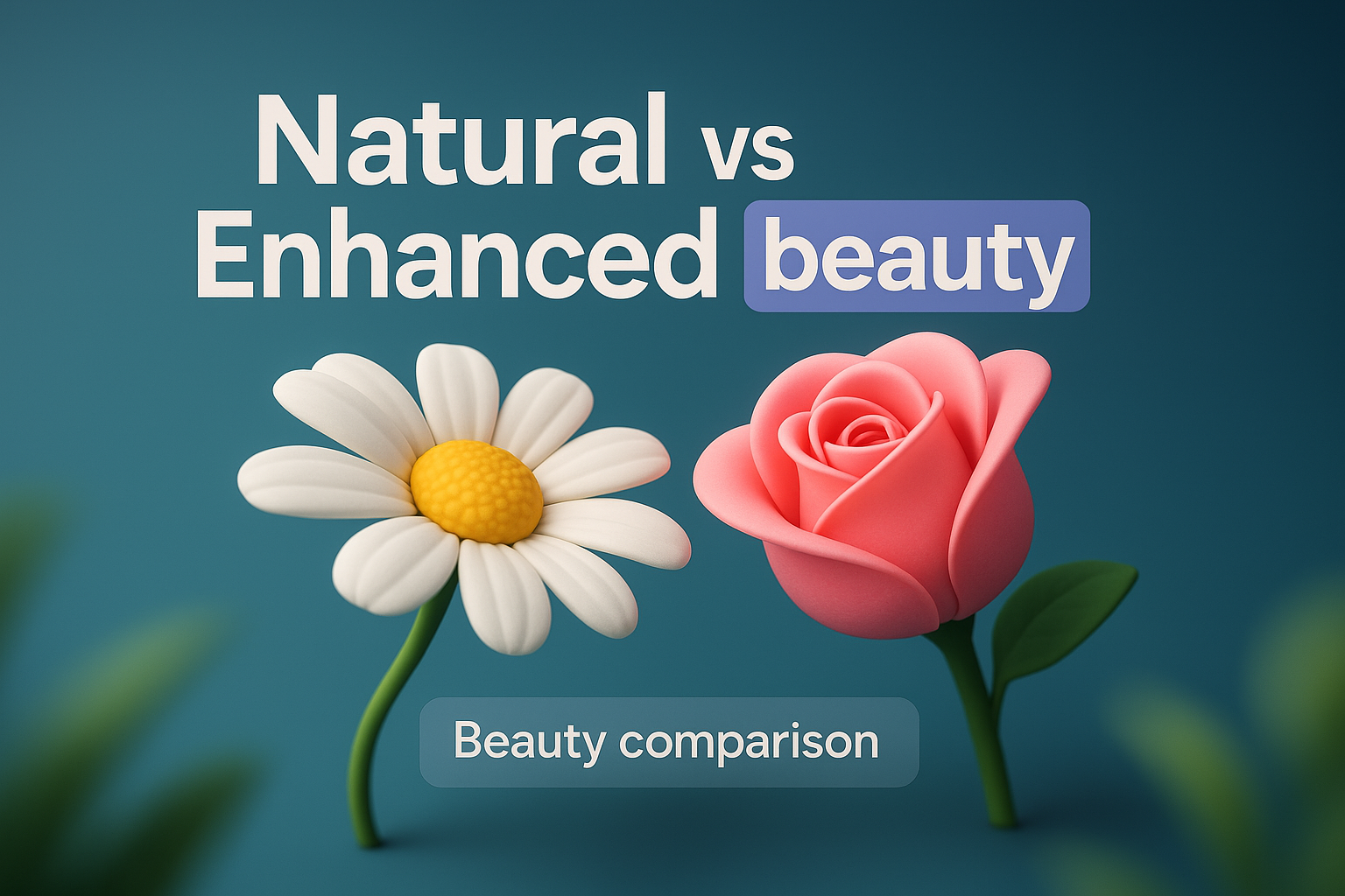 This image features a creative comparison of natural and enhanced beauty, depicting a daisy and a rose. The design is modern and visually appealing, suitable for beauty or cosmetic discussions.