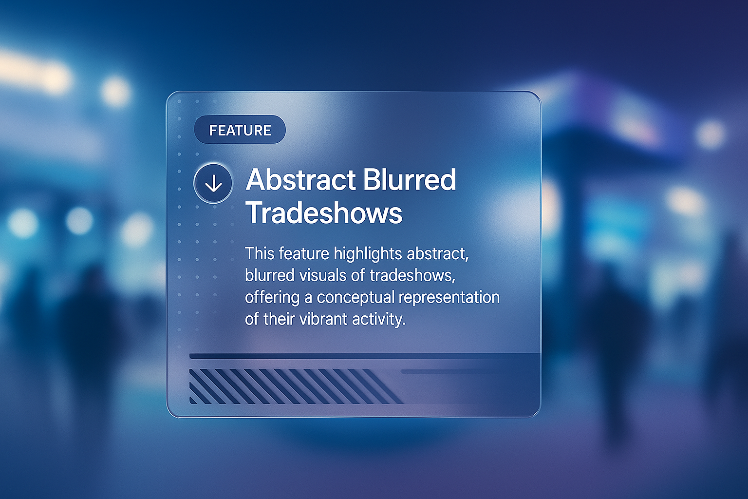 A visually striking representation of abstract blurred tradeshow scenes, featuring a translucent panel with text highlighting the vibrancy of such events.