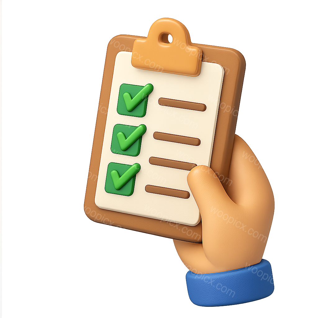 A 3D rendered icon featuring a hand holding a checklist with green checkmarks. The design has a transparent background and showcases a modern isometric style.