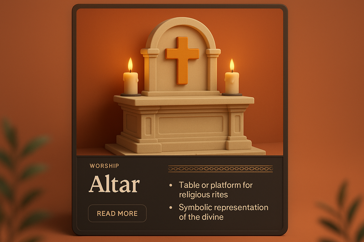 A beautifully designed 3D altar featuring candles, a cross, and intricate details. This visual composition highlights its role in worship and religious ceremonies.