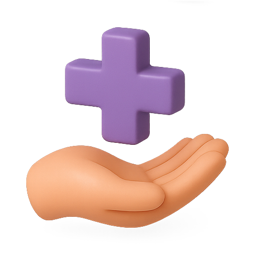 A modern 3D graphic featuring a hand in a soft tone holding a purple plus sign. This design symbolizes support and assistance, suitable for healthcare or positive messaging.