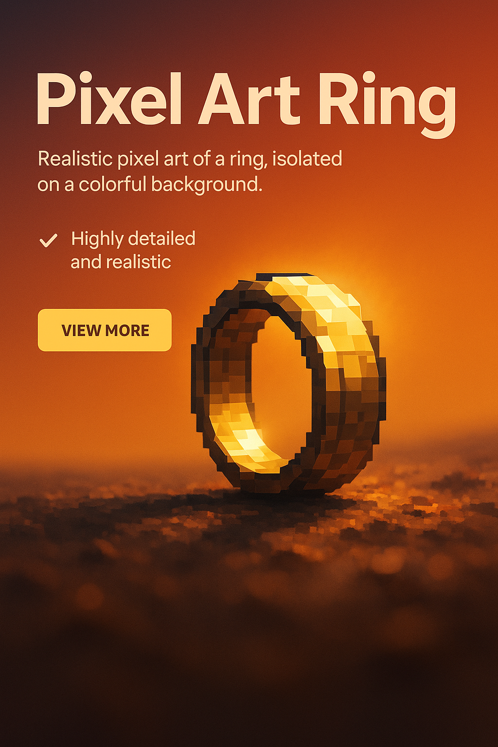 This image features a detailed pixel art representation of a ring set against a vibrant background. It is designed for promotional use, likely for jewelry or digital art.