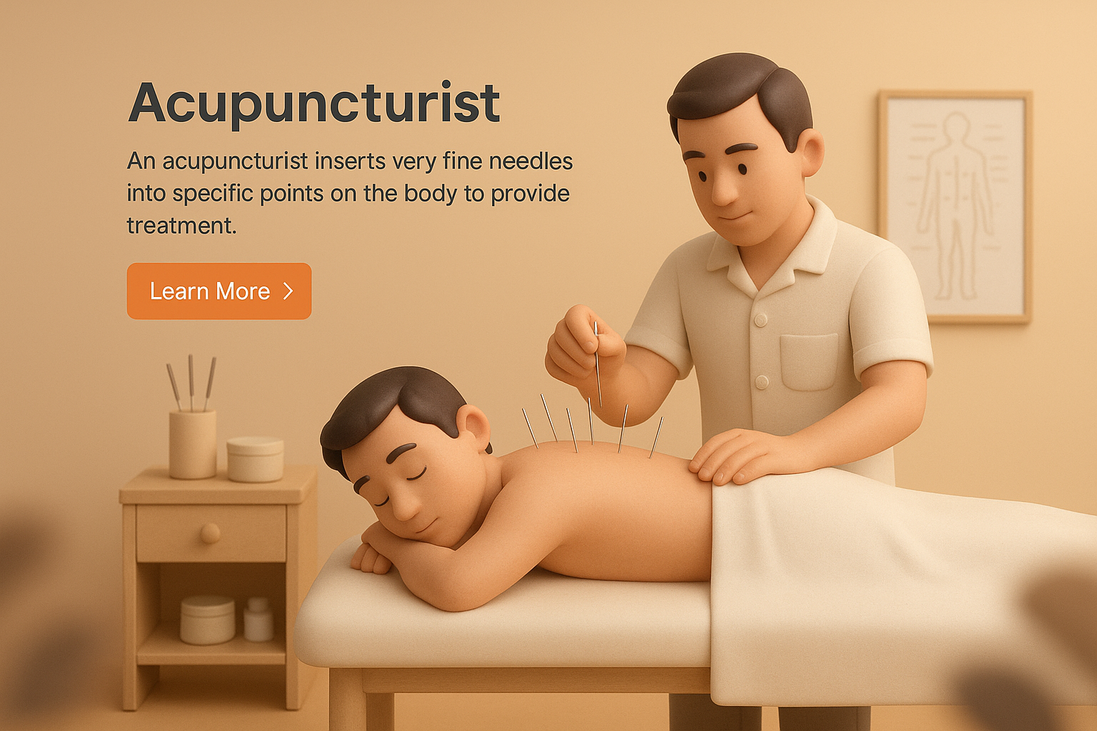 /Collection: /by davooda/Type: PNG/A detailed 3D illustration showing an acupuncturist treating a patient. The scene features a soothing gradient background and includes text and action buttons for a cohesive design.