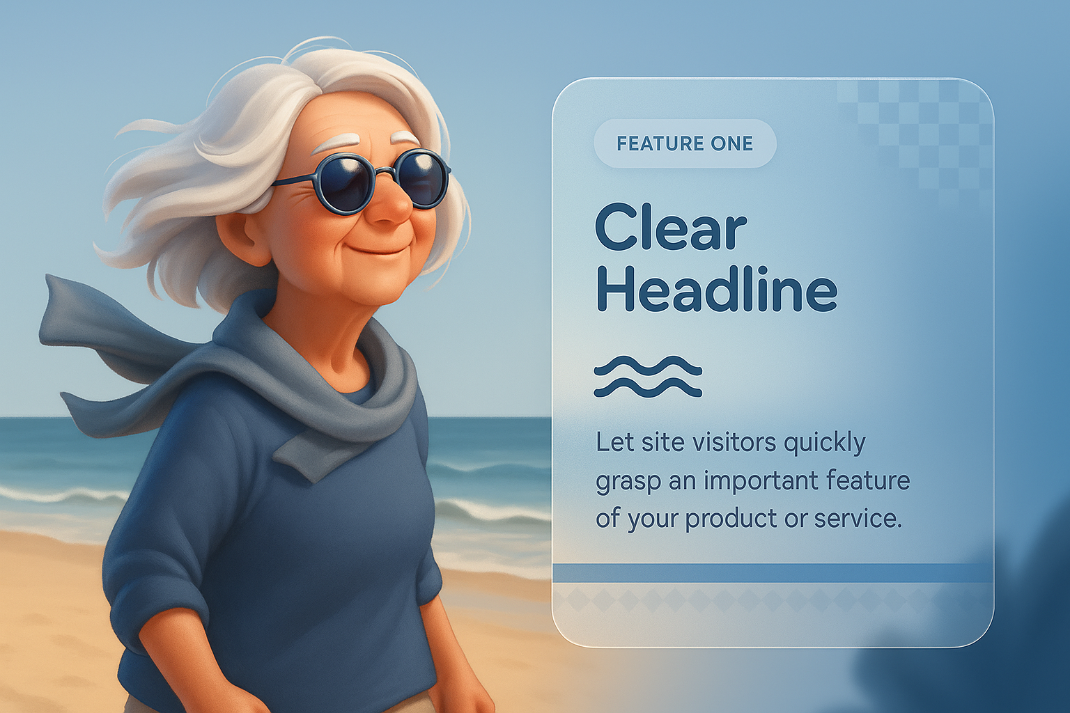 /Collection: /by davooda/Type: PNG/A mature woman with white hair, wearing sunglasses and a scarf, stands on the beach. A stylish information block highlights a feature with a clear headline, enhancing the coastal scene.