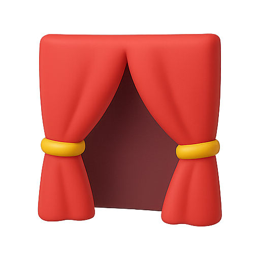 A vibrant 3D-rendered icon of red curtains with yellow tiebacks, symbolizing a theatrical or performance setting. Ideal for use in applications related to events or entertainment.