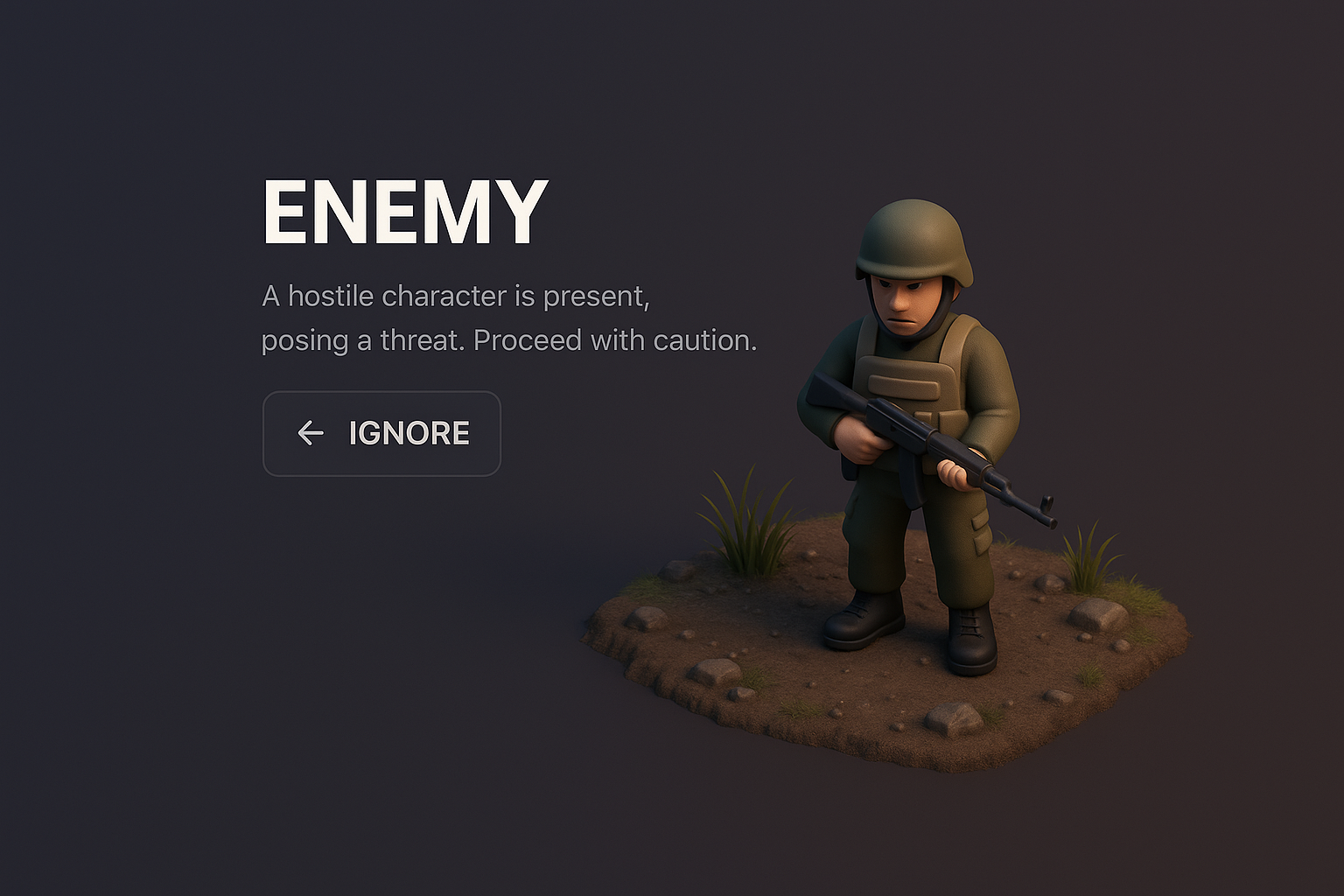 /Collection: /by davooda/Type: PNG/A zoomed-out 3D scene depicting a hostile character with a weapon. The dark gradient background enhances the focus on the character, who stands on a small, detailed patch of land.