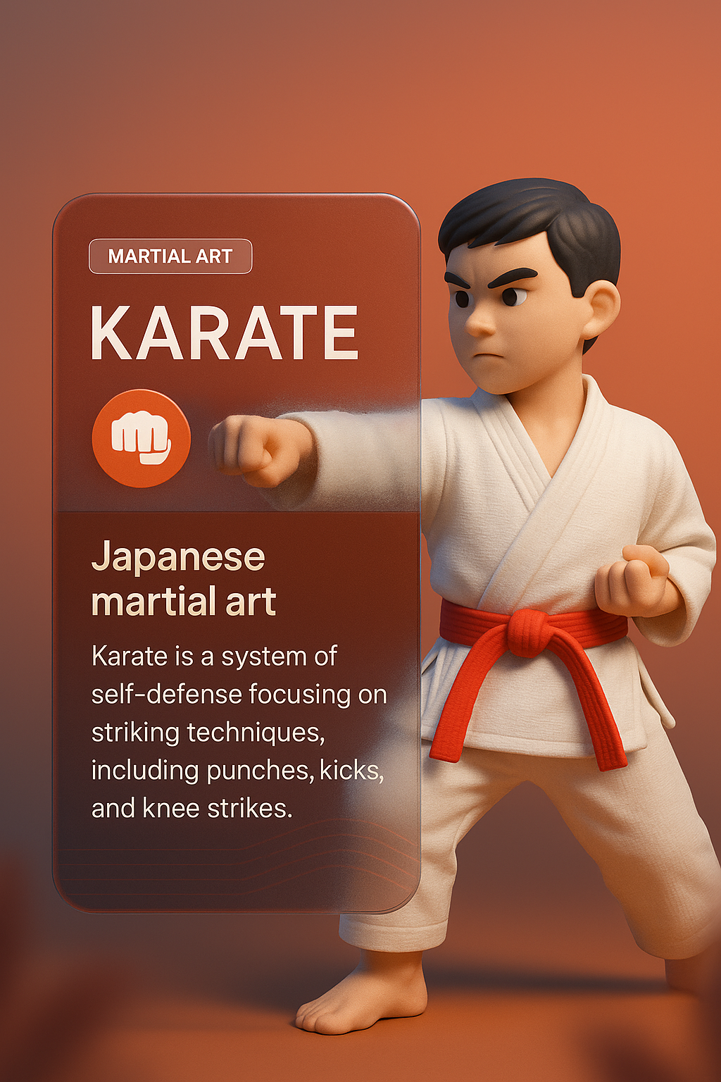 A dynamic 3D illustration of a karate practitioner in action, with a translucent overlay that includes text about karate as a martial art. The background features a smooth gradient.