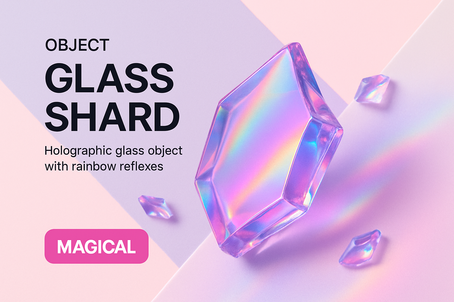 A visually striking holographic glass shard reflects rainbow hues of pink and purple. The modern design features a clean layout with bold typography, creating a dynamic and magical effect.