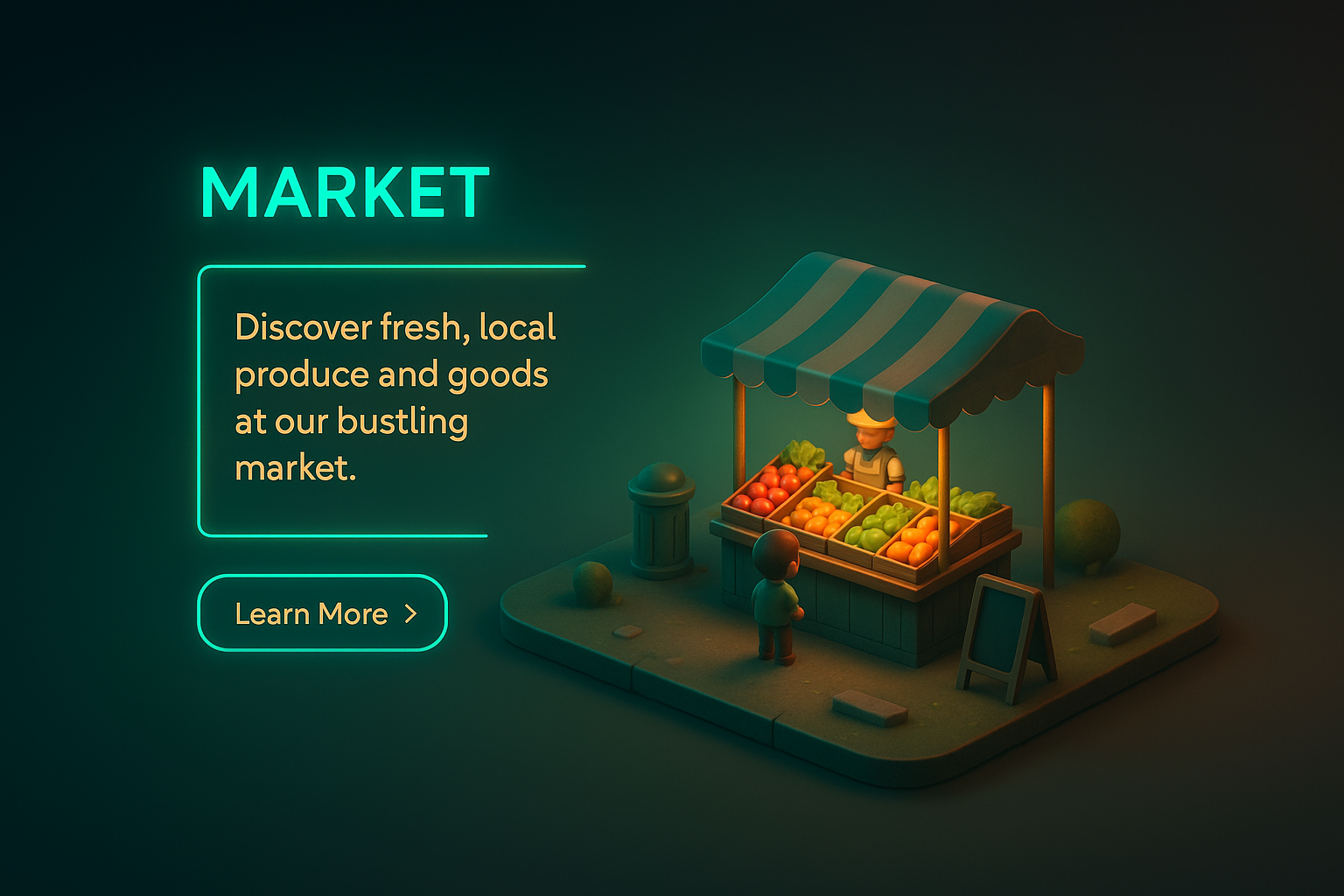 /Collection: /by davooda/Type: PNG/A beautifully designed 3D market scene featuring a vendor stall filled with fresh produce. The background is dark with neon accents, creating a vibrant atmosphere. The scene is viewed from a distance, enhancing its small-scale appearance.