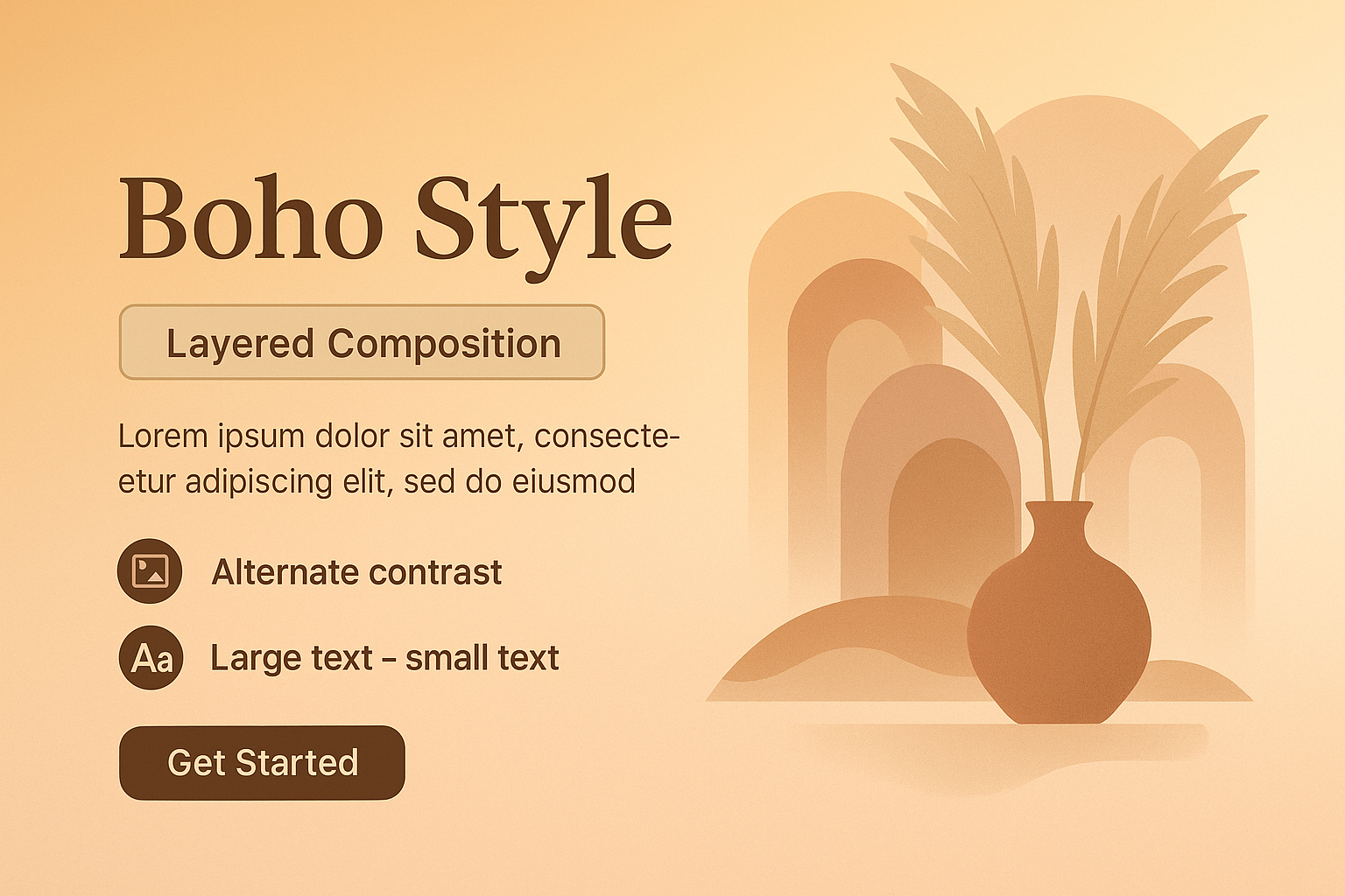 A modern graphic featuring a layered composition with a vase and plant, designed for a Boho style aesthetic. Ideal for social media or web use.